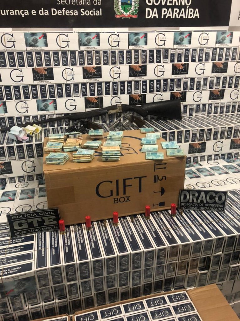 A Polícia Civil da Paraíba apreendeu na noite dessa sexta-feira, 16 de julho, quase 700 mil unidades de cigarros contrabandeados, duas espingardas, dois revólveres e R$ 124.255,00 entre dinheiro e talões de cheques. A ação foi realizada pelas equipes da Delegacia de Repressão ao Crime Organizado (DRACO) e o Grupo Tático Especial (GTE) de Patos.