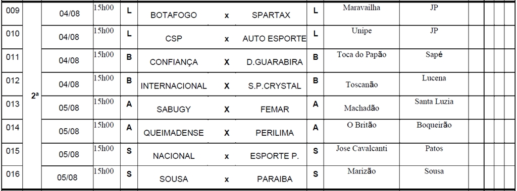 A Federação Paraibana de Futebol (FPF) divulgou nesta segunda-feira (26), a tabela detalhada da primeira fase do Campeonato Paraibano sub-19. Com 20 times, divididos em quatro grupos regionais, esta primeira parte da competição terá 40 jogos, com a primeira rodada marcada para este sábado (31) e domingo (1º). A última rodada desta fase está prevista para o dia 15 de agosto (confira a tabela detalhada no final da matéria).