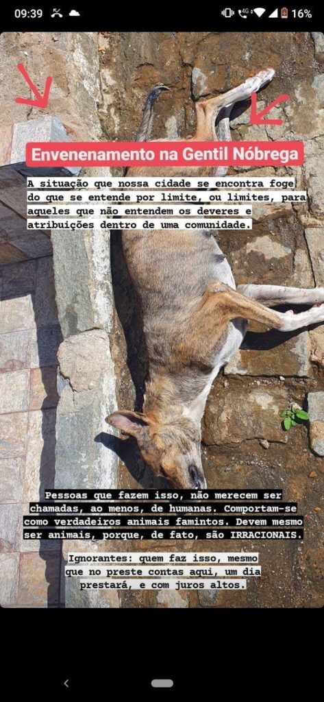Nos últimos meses, em Condado, região metropolitana de Patos, vários animais estão sendo encontrados mortos em vias públicas e avenidas. Em menos de três meses, mais de 20 cachorros foram mortos de forma covarde, por envenenamento e foram encontrados por populares.