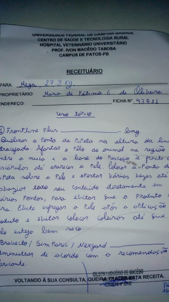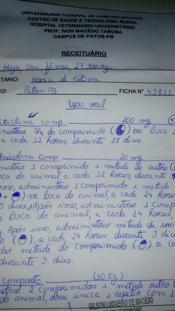Fátima levou o animal ao médico veterinário e mostrou preocupação com o estado de saúde de Mega, uma vez que o veterinário disse que a cadela poderia ter menos de 15 dias de vida, caso a medicação não venha a ser ministrada.