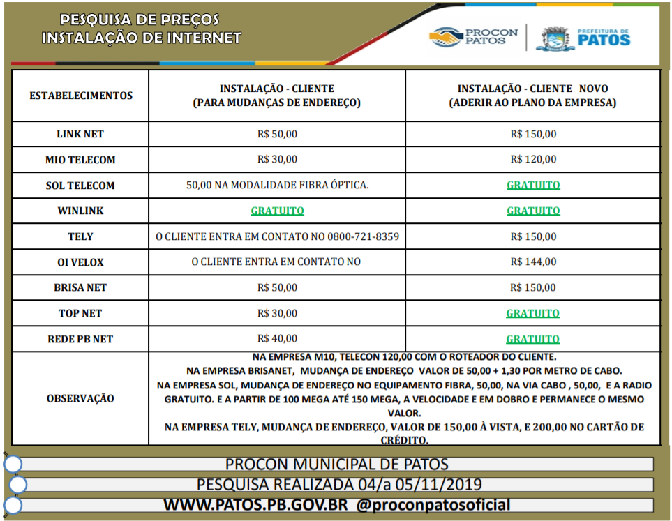 A Secretaria Municipal de Defesa do Consumidor (PROCON Patos) realizou nestes dias 04 e 05 de novembro, a terceira pesquisa do preço da internet no ano de 2019. Os dados da pesquisa mostram que os valores dos pacotes oferecidos pelas empresas variam de acordo com o provedor, velocidade e instalação.