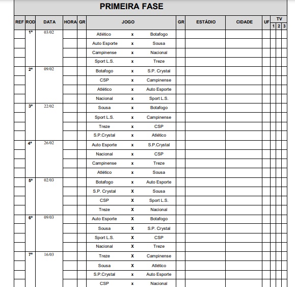Como cada chave tem cinco equipes, a cada rodada, que terá dois jogos, uma equipe terá que ficar de folga nas partidas de ida e volta. A primeira fase começa no dia 3 de fevereiro e tem sua última partida marcada para o dia 30 de março. No dia 26 de fevereiro acontecem o Clássico dos Maiorais entre Campinense e Treze, e também Atlético de Cajazeiras x Sousa, enquanto o primeiro Botauto será na outra semana, no dia 2 de março.