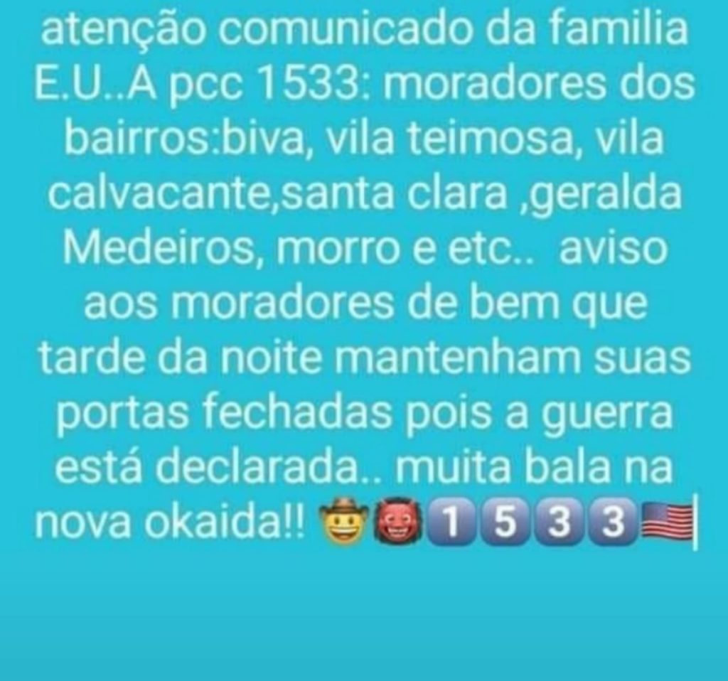 Ainda no setor sul da cidade, um outro aviso circula nas redes sociais: “Atenção: moradores do bairro Mutirão, Jatobá, Monte Castelo e Alto, a guerra começou agora, evitem de ta em meio de rua tarde, porque vai continuar sendo derramado sangue de EUA e PCC, enquanto tiverem derramando sangue de irmãos da gente, Patos não terá paz […]”.