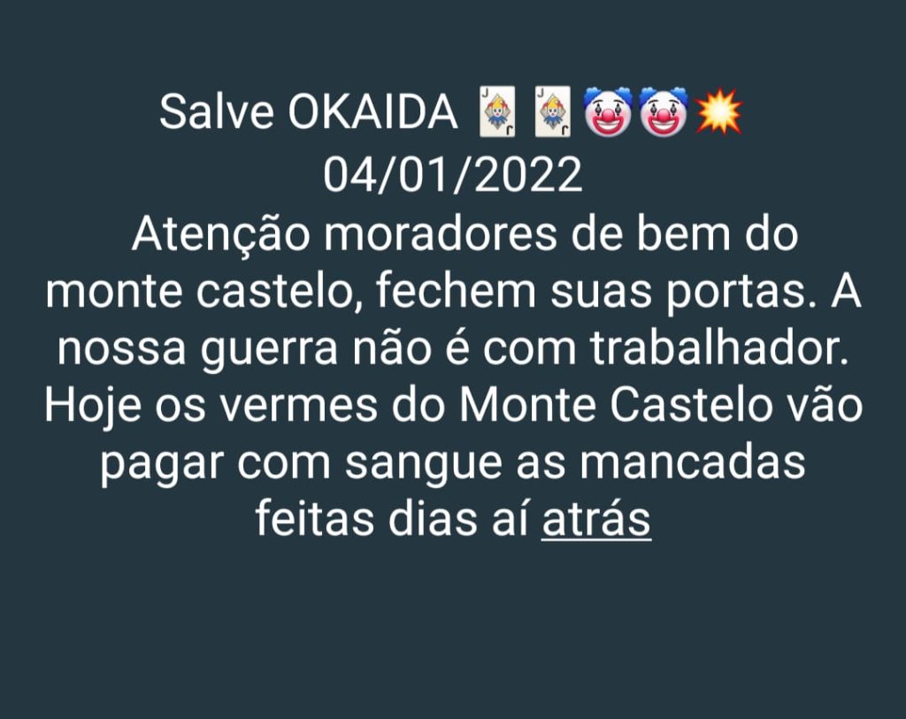 Em outro aviso, uma das facções alerta para possíveis confrontos no setor sul da cidade, especificamente no bairro Monte Castelo: “Atenção moradores de bem do Monte Castelo, fechem suas portas. A nossa guerra não é com trabalhador. Hoje os vermes do Monte Castelo vão pagar com sangue as mancadas feitas dias aí atrás”, dizia o aviso referente a essa terça-feira (04).