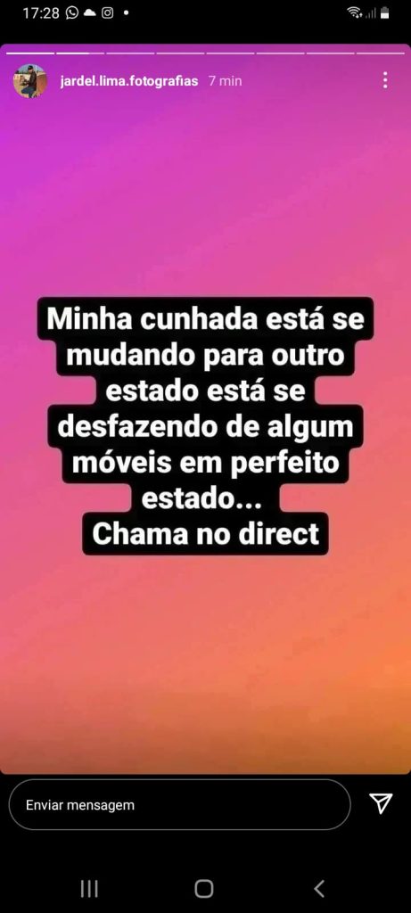 Para justificar os preços baixos, os golpistas colocaram uma mensagem no story afirmando que os produtos pertencem a uma “cunhada” de Jardel que está se mudando para outro estado e precisa se desfazer rapidamente dos móveis, que estão em perfeito estado.