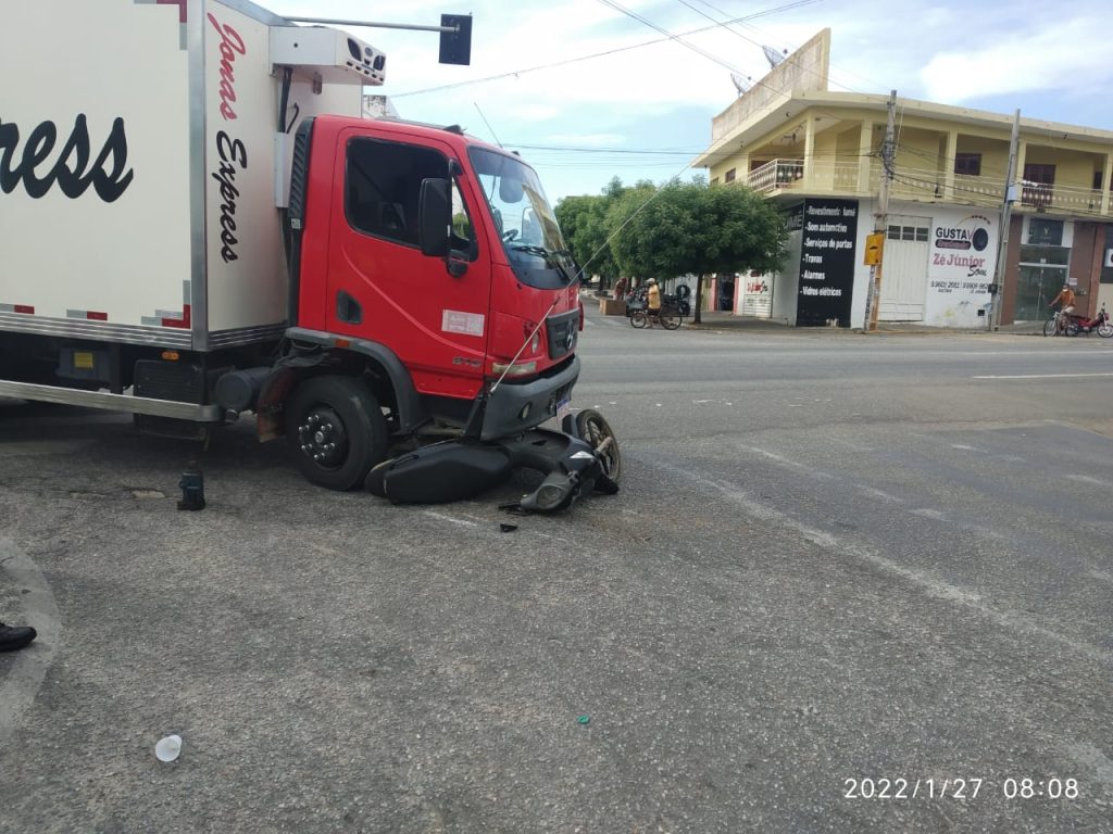 Informações fornecidas pelo agente da Sttrans, Antônio Coelho, foi que recebeu a informação de um dos condutores de que a motoneta estava no sentido em frente e o caminhão realizando a conversão a direita a qual provocou a colisão transversal.