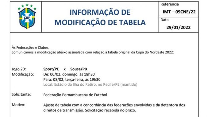 Na última sexta-feira (29), em oficialização ocorrida apenas no domingo (30), a Confederação Brasileira de Futebol modificou a data da partida do Sousa pela terceira rodada da fase de grupos da Copa do Nordeste.