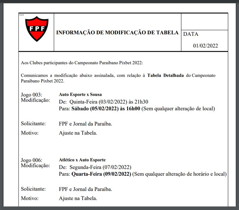 Atendendo à solicitação do site que transmitirá os jogos do Campeonato Paraibano, a Federação Paraibana de Futebol modificou as datas de dois jogos que envolvem o Auto esporte e fazem parte da primeira e segunda rodadas da competição.