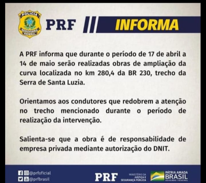 A Polícia Rodoviária Federal informou aos usuários das rodovias federais sobre uma obra que está sendo realizada no KM 280,4 da BR-230, trecho que compreende à Serra de Santa Luzia-PB. Os serviços de readaptação estão visando melhorias e correções em vários aspectos para beneficiar o trânsito e oferecer mais segurança em uma curva aos condutores.