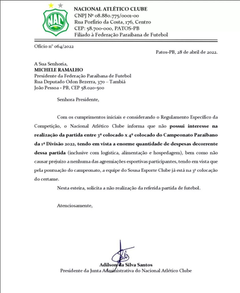 O Nacional de Patos, eliminado nas semifinais do Campeonato Paraibano Pixbet 2022, emitiu na manhã desta quinta-feira um ofício endereçado à Federação Paraibana de Futebol (FPF-PB) afirmando não ter interesse em participar da disputa do terceiro lugar do estadual, contra o Sousa. O documento é assinado pelo presidente da Junta Administrativa que rege o Canário, Adilson Santos, e foi enviado à entidade máxima do futebol do estado na manhã de hoje.