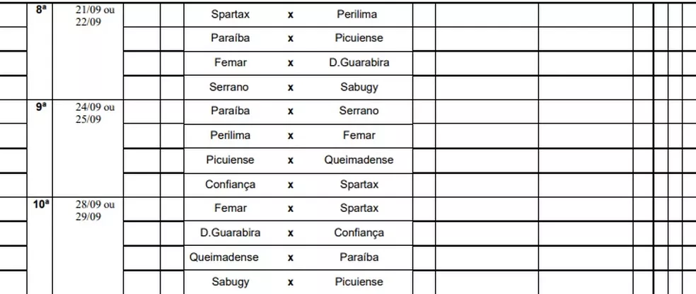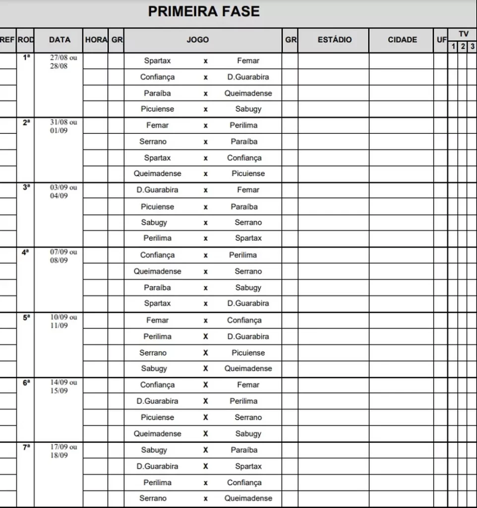 A Federação Paraibana de Futebol (FPF-PB) divulgou na manhã desta quarta-feira a tabela básica da primeira fase do Campeonato Paraibano da 2ª divisão. O conselho arbitral que definiu todos os detalhes da competição aconteceu na última terça-feira à tarde, com representantes dos 10 clubes participantes. A bola vai rolar na Segundona no fim do mês de agosto.