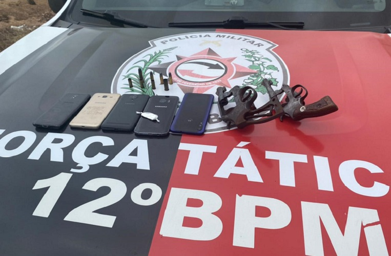 Com os meliantes foram apreendidos quatro aparelhos celulares que segundo a PM, seria fruto do assalto realizado nesta segunda-feira (1º) em Brejo dos Santos. Além dos celulares, dois revólveres com quatro munições intactas e seis deflagradas, uma porção de substância semelhante à cocaína, uma moto e uma faca, também foram apreendidos. O local onde os objetos estavam é um esconderijo próximo à área onde houve o confronto. De acordo com a Polícia Militar, os revólveres, um calibre 38 e outro 32, teriam sido utilizados para efetuar disparos contra as guarnições.