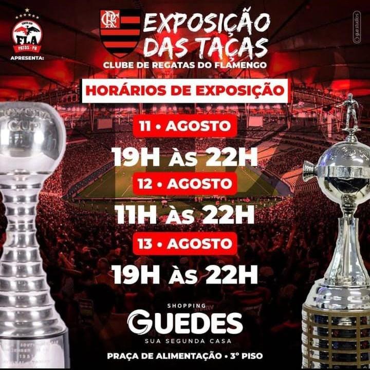 Por meio de uma parceria entre a torcida organizada do Flamengo, @Flapatospb, e o Guedes Shopping, as taças de Campeão Mundial de Clubes do Flamengo de 1981 e da Libertadores da América de 2019, conquistadas pelo Flamengo, estarão expostas na cidade de Patos, entre os dias 11 e 13 de agosto.