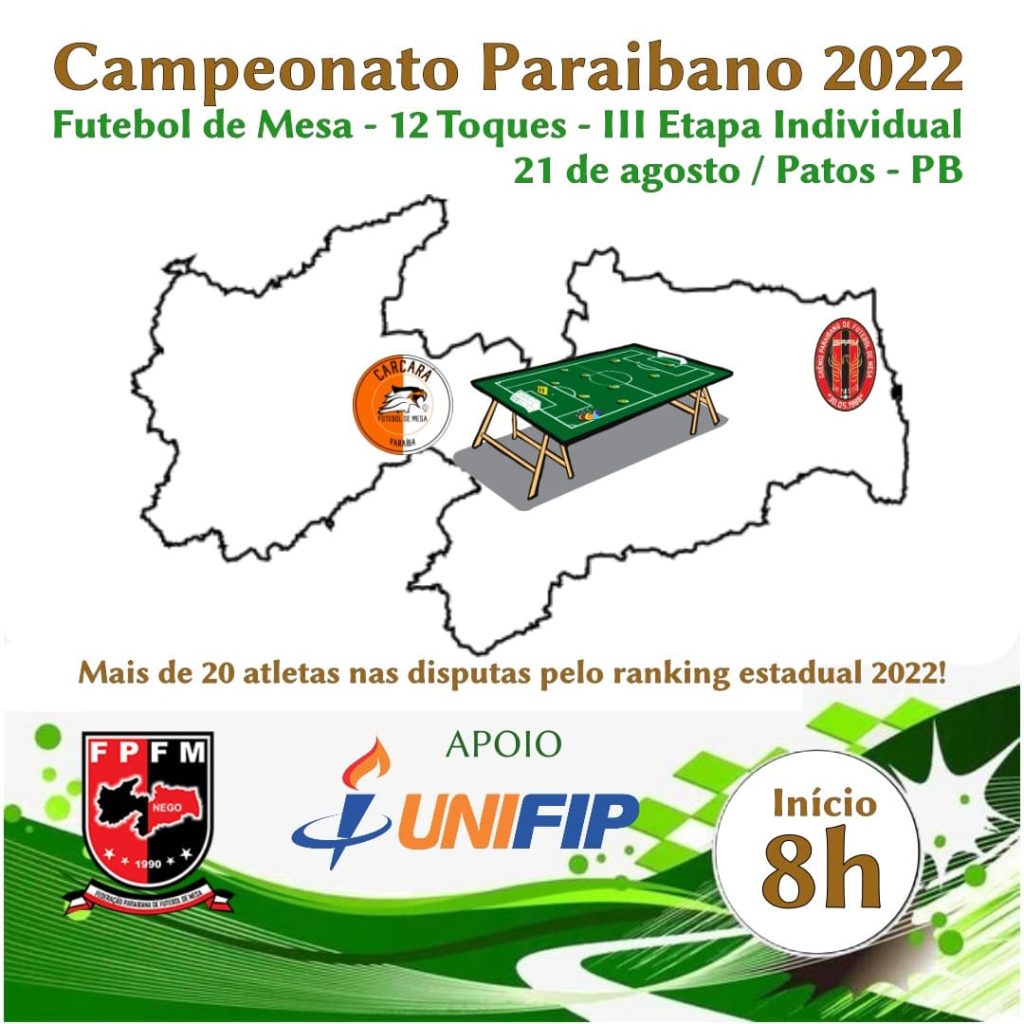 No próximo domingo, dia 21, ocorrerá na cidade de Patos a terceira etapa do Campeonato Paraibano de Futebol de Mesa - Modalidade 12 toques.