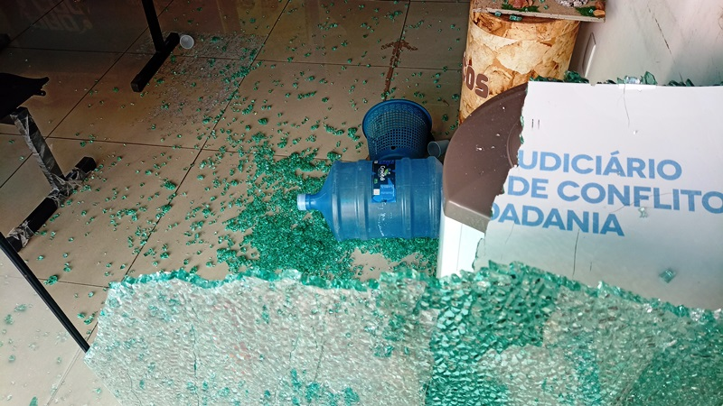 De acordo com informações, uma pedra foi arremessada na porta de vidro principal do prédio, que acabou se despedaçando.