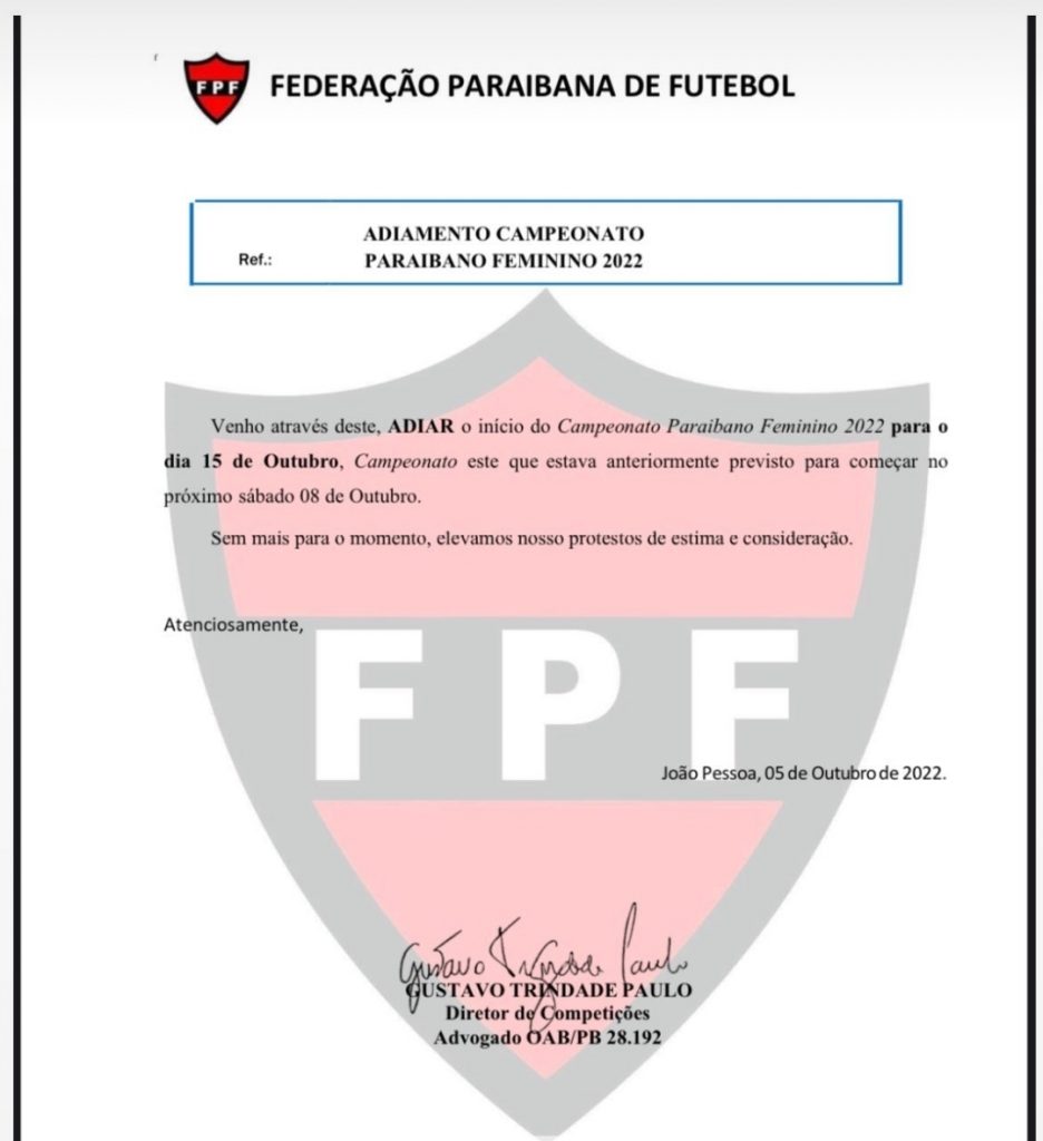Faltando três dias para o início da competição, a Federação Paraibana de Futebol, por meio de um comunicado oficial, anunciou o adiamento do início do estadual feminino de 2022 em uma semana.