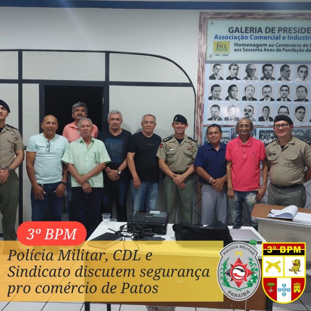 O comandante do 3º BPM, através da seção de planejamento e estatística, apresentou em reunião com a Câmara de Diretores Lojistas e membros do Sindicato do Comércio de Patos, dados estatísticos do índice criminal na área comercial, a fim de traçar planos que aprimorem o policiamento aumentando a sensação de segurança na cidade de Patos.