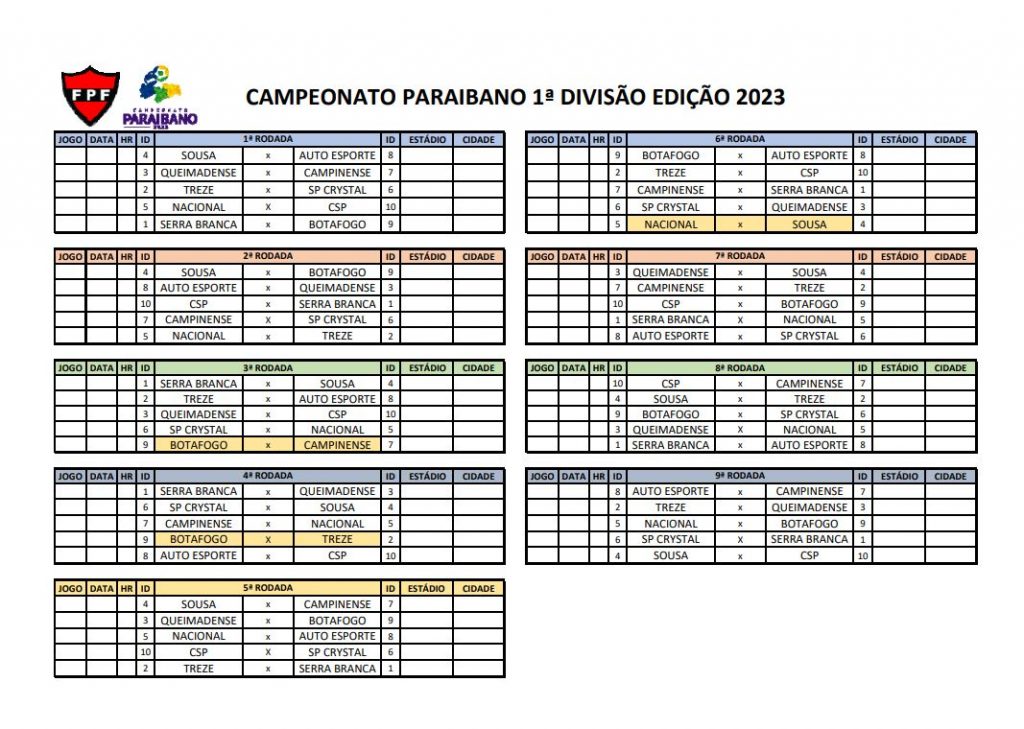 A tabela definitiva com as demais datas, horários e locais dos confrontos será divulgada nos próximos dias pela FPF. O Nacional abre e fecha a sua partiicipação na fase inaugual do Paraibano em seus domínios. É bom lembrar que os estádios paraibanos seguem interditados até que uma nova reunião aconteça para definir os trâmites para liberação.