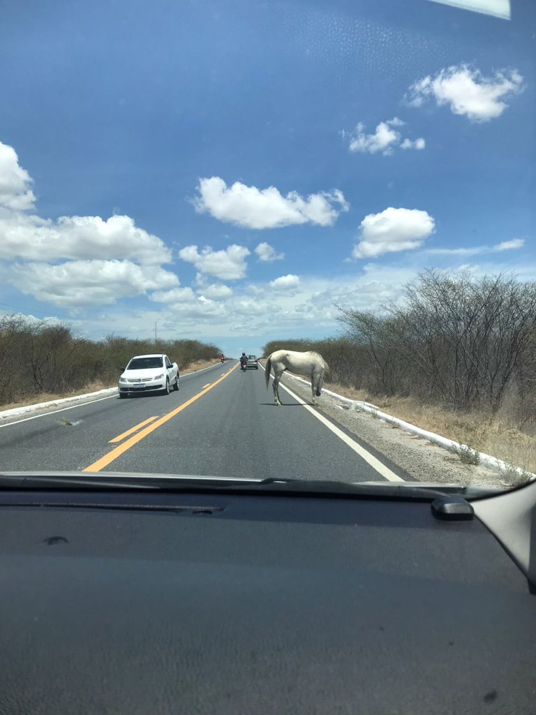 De repente, eles se depararam com um cavalo de cor branca, praticamente no meio da pista. O carro que seguia para Patos teve que desviar, chegando a ocupar parte da pista contrária. Já o outro veículo que vinha teve que frear para evitar o que poderia ser uma colisão frontal.