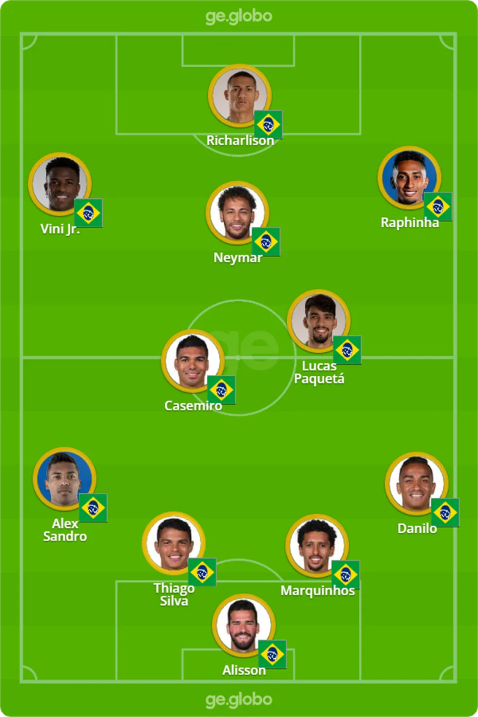 Sem surpresas. A seleção brasileira está escalada pelo técnico Tite para a estreia da Copa do Mundo, contra a Sérvia, com Alisson; Danilo, Marquinhos, Thiago Silva e Alex Sandro; Casemiro e Paquetá; Raphinha, Neymar, Richarlison e Vinicius Junior.
