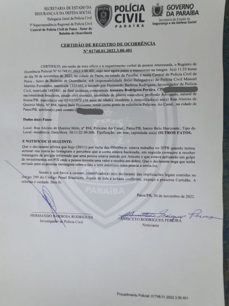 Aniceto foi até a Delegacia de Polícia Civil de Patos e prestou um Boletim de Ocorrência sobre o caso. Ele reforça aos amigos e seguidores que os anúncios são falsos e se tratam de golpes.