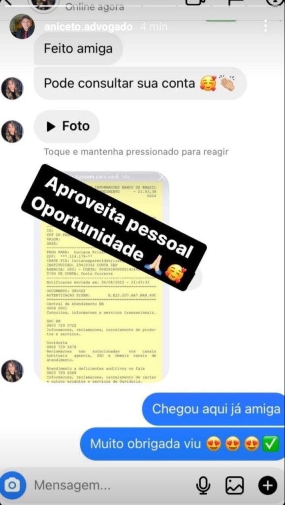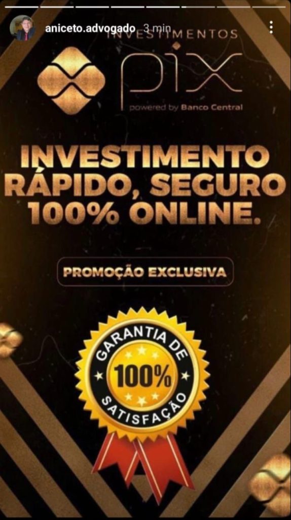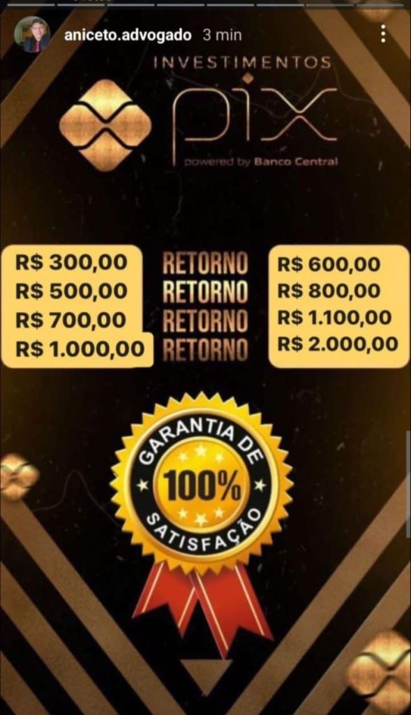 De acordo com ele, por volta das 09h00min da manhã de hoje (30), sua conta foi invadida pelos criminosos que passaram a divulgar anúncios no storys sobre um investimento em PIX, onde teria o retorno dobrado do valor.