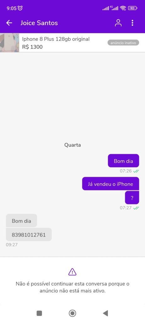 De acordo com o relato do primeiro internauta, na última quarta-feira (30), ele viu o anúncio de um iPhone 8 Plus 128gb, na OLX, pelo valor de R$ 1.300,00 e se interessou pelo aparelho. Ao conversar com a vendedora, a mesma informou que residia aqui na cidade de Patos.