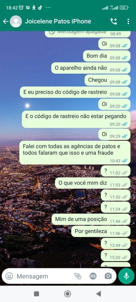 Ele então se interessou pelo celular e resolveu comprar. A vendedora disse que enviaria o aparelho na sexta-feira (05). Ela mostrou imagens indo até uma agência dos Correios, que seria da cidade de Patos, e enviando o celular, e logo em seguida a foto de um comprovante.