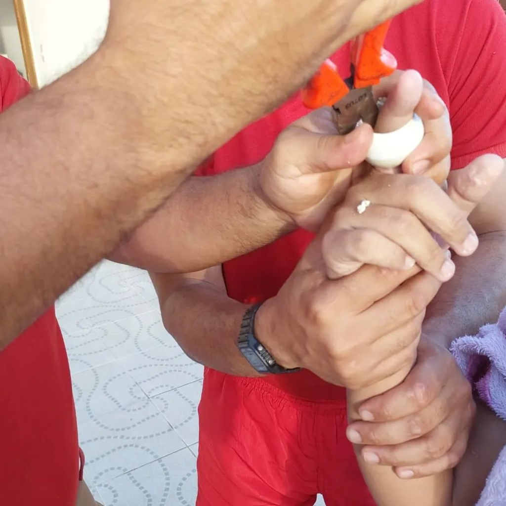 O Corpo de Bombeiros foi acionado e enviou equipe ao local para realizar os procedimentos de socorro. Foi necessário retirar o anel de saída de água da piscina, e só então levar a criança ao hospital. Na unidade hospitalar, foi usada uma ferramenta para romper o objeto e livrar a criança.