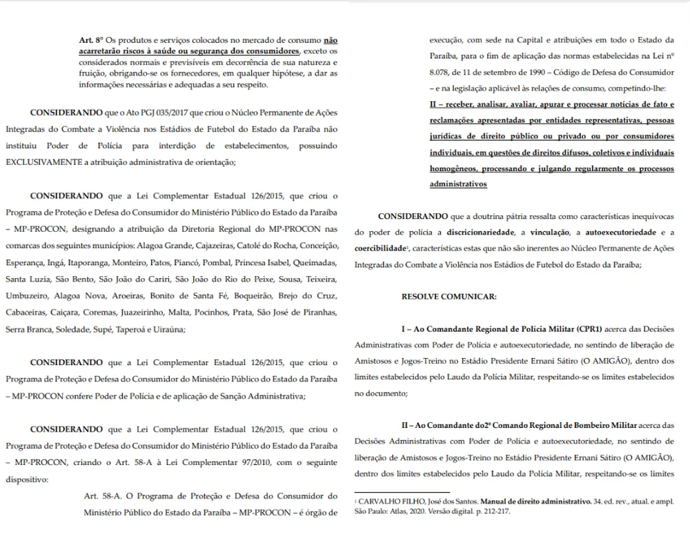 Em sua decisão, o procurador de Campina Grande considerou ainda que o Amigão possui laudos em vigor, liberando o estádio até o dia 31 de dezembro — mesmo que com restrições. Foi por esse mesmo entendimento que a praça esportiva pôde receber os jogos do Campinense na Série C do Campeonato Brasileiro, por exemplo.