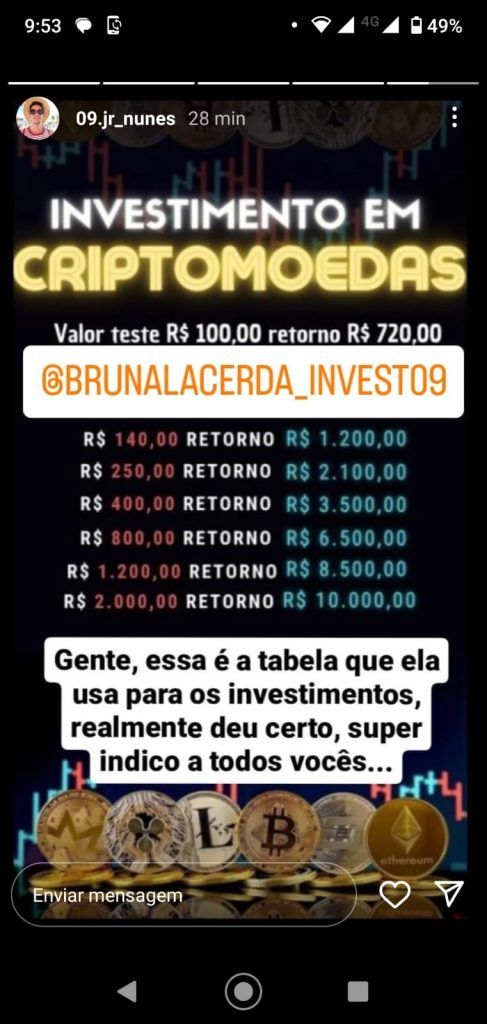 "Sofri um golpe no Instagram, através criptomoedas, você investe um valor para receber outro, após o investimento perdi todo o acesso de minhas contas no Instagram, e hoje estão me pedindo mais dinheiro para liberar minha rede social, enquanto isso ficam postando storys se passando por mim e tentando aplicar novos golpes em outras pessoas", disse a vítima
