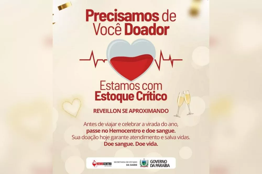 Hemocentro Hemocentro da Paraíba registra estoque de sangue em nível crítico; confira datas e horários de atendimento no feriadão de Ano Novo em Patos-PB