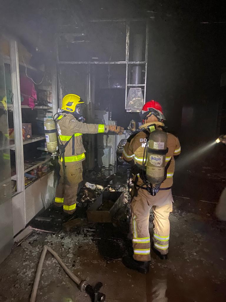 O comandante informou que as equipes conseguiram chegar até o local do incêndio após arrombarem a porta principal do supermercado, sendo realizado o trabalho de combate com o auxílio de um hidrante que havia ao lado da máquina em chamas, e o pessoal retirado com segurança posteriormente.
