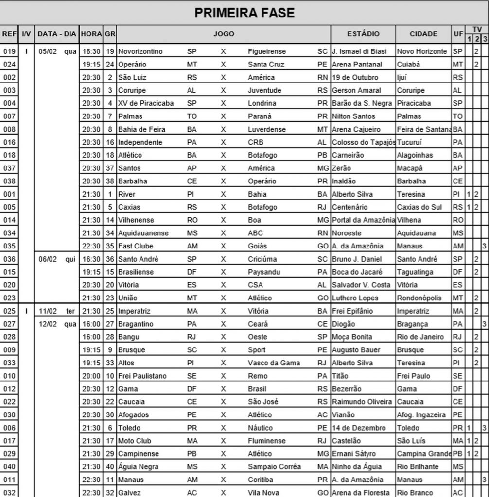 A CBF divulgou na tarde desta sexta-feira a tabela detalhada da Copa do Brasil. Foram definidos todas as datas, horários e locais das partidas válidas pela primeira fase da competição, que começa a ser disputada no dia 5 de fevereiro.
