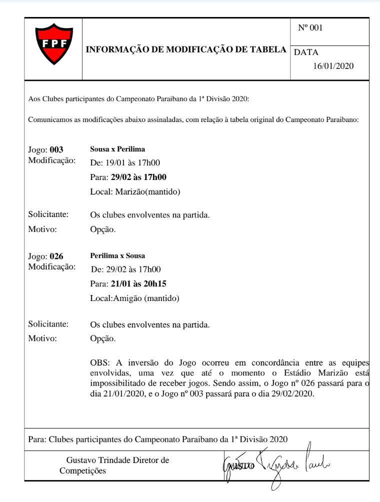 Por meio de comunicado oficial, a entidade que rege o futebol do estado inverteu o mando de campo do duelo entre Sousa e Perilima, inicialmente marcado para domingo (19), no estádio Marizão, no sertão do estado.