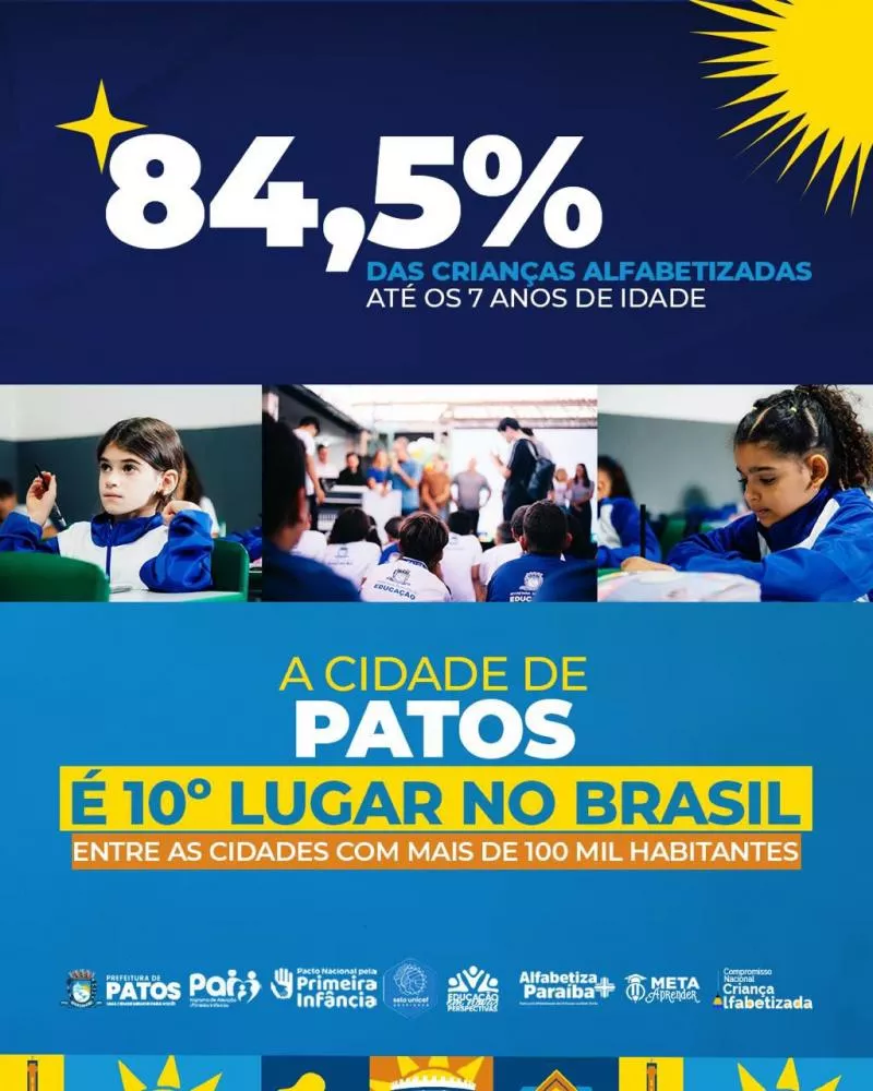 ALFABETIZAÇÃO Patos conquista 10º lugar no ranking nacional de alfabetização entre municípios com mais de 100 mil habitantes