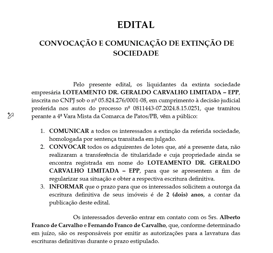 Edital de Convocação Extinção de empresa de loteamento em Patos é oficializada; compradores devem regularizar escrituras