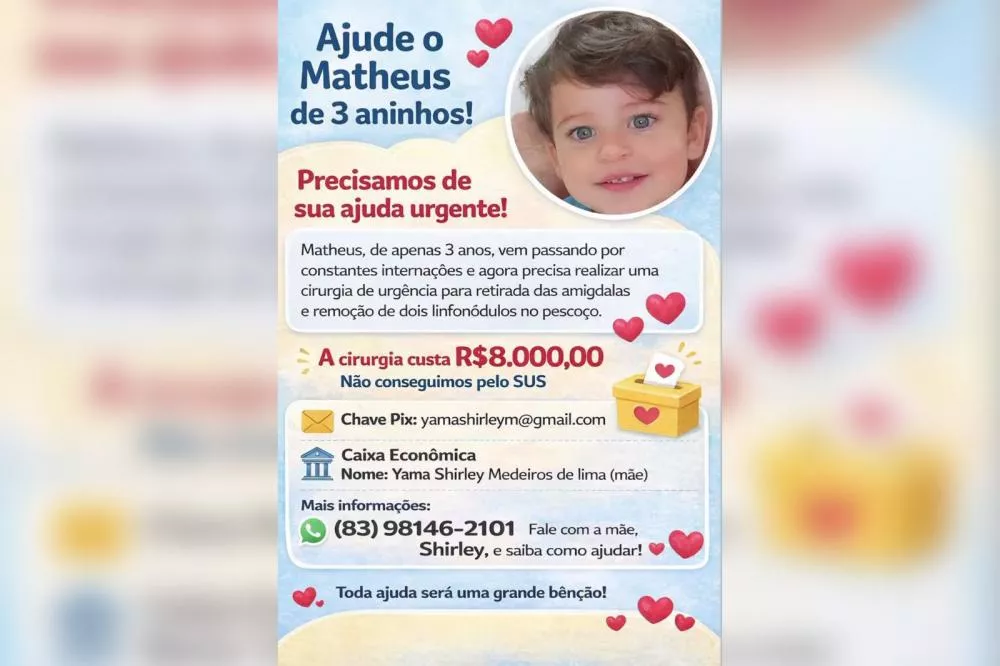 Campanha solidária Família de criança de 3 anos em Patos faz campanha para custear cirurgia de urgência no valor de R$ 8 mil