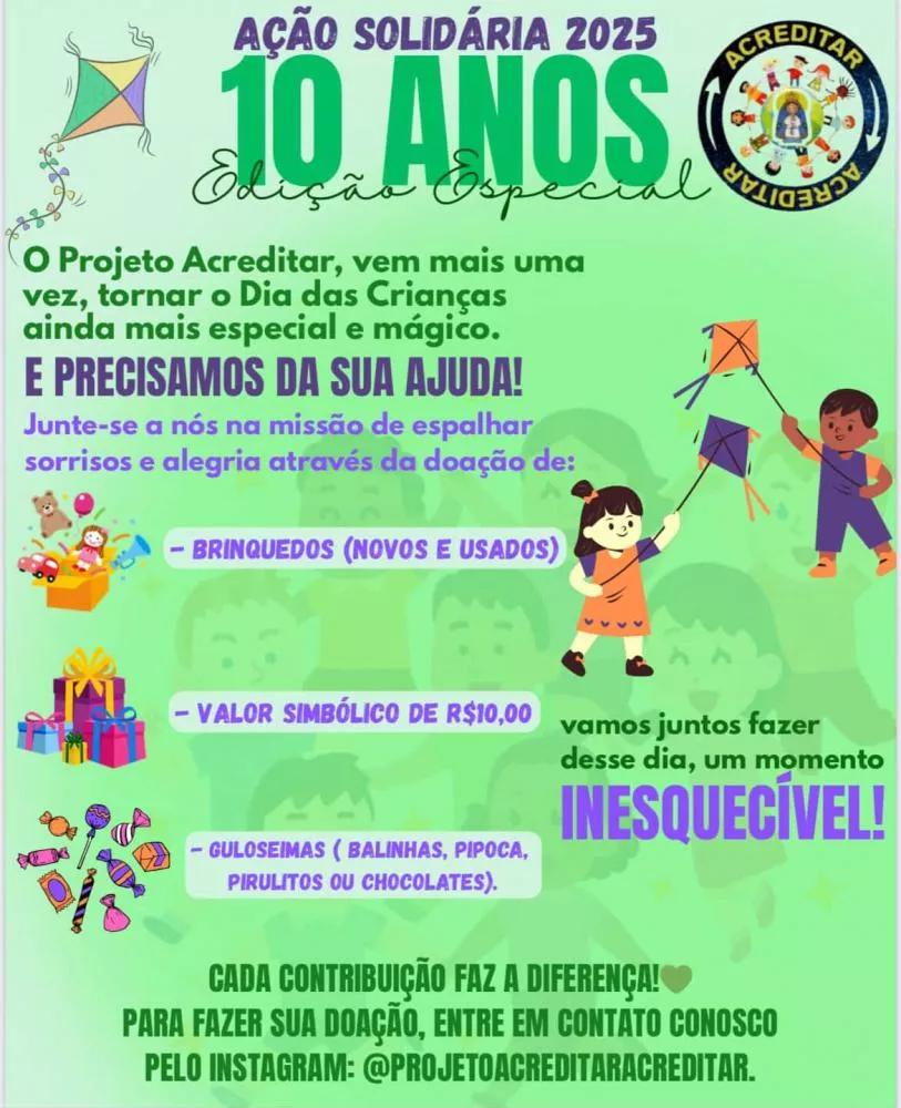 O Projeto Acreditar, iniciativa que há uma década leva alegria às crianças de Santa Luzia-PB, está em campanha para mais uma edição especial do Dia das Crianças. A ação, que começou de forma singela com a doação de brinquedos, hoje reúne voluntários e toda a comunidade local em torno de um gesto de solidariedade que já se tornou tradição.