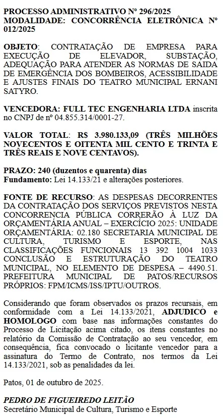 A Prefeitura de Patos homologou, na última quarta-feira (1º), o resultado da Concorrência Eletrônica nº 012/2025, que definiu a empresa responsável pela execução da última etapa de obras no Teatro Municipal Ernani Sátyro. O espaço cultural, que está em construção há mais de uma década, terá adequações estruturais e de acessibilidade para poder ser entregue à população.