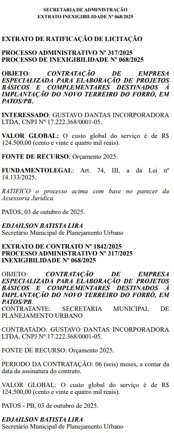 A Prefeitura de Patos, por meio da Secretaria Municipal de Planejamento Urbano, publicou no Diário Oficial dos Municípios desta terça-feira (7), o Extrato de Inexigibilidade nº 068/2025, que formaliza a contratação da empresa para a elaboração dos projetos básicos e complementares destinados à implantação do novo Terreiro do Forró.