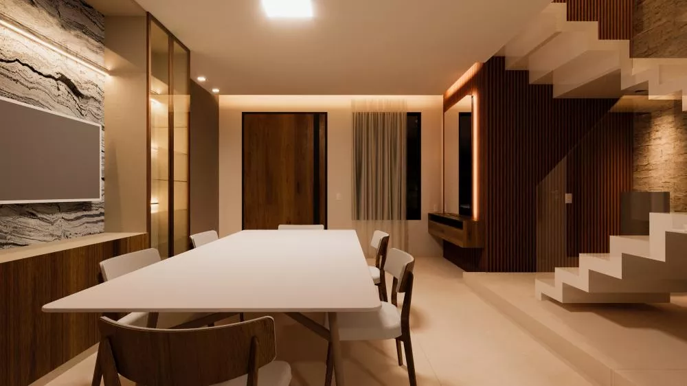 Entre os trabalhos desenvolvidos pela Átrio estão residências acolhedoras e funcionais, com interiores pensados para o bem-estar, iluminação natural e conforto sensorial, além de espaços corporativos e comerciais marcantes, como o estúdio do PodPatos, que também funciona como escritório e ambiente criativo.