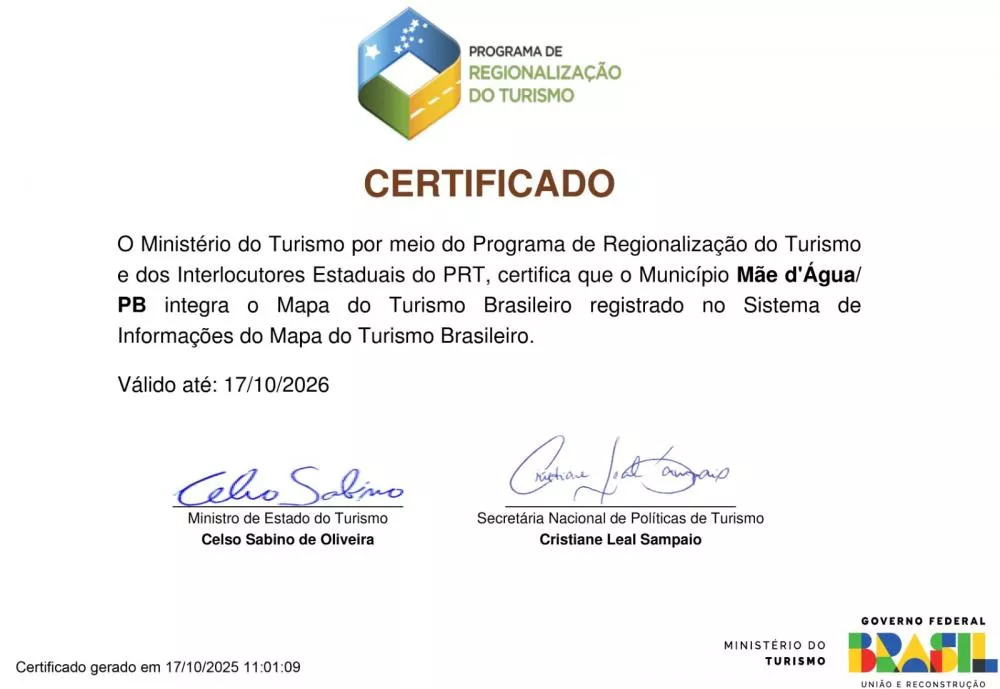 A publicação da certificação se deu perto de 12h desta sexta-feira, 17 de outubro de 2025, com cópia do documento apresentado ao prefeito Jucélio Pereira Moura que, já a partir dos primeiros dias do seu mandato, determinou todas as providências necessárias, incluindo a contratação de uma empresa para o trabalho de mapeamento e encaminhamento da documentação necessária à referida inserção, além da constituição do Conselho Municipal de Turismo.