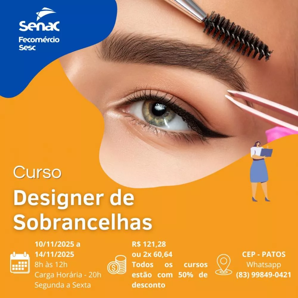 - Designer de Sobrancelhas - R$ 121,28 ou 2x de R$ 60,64 (10/11 a 14/11 | 08h às 12h)