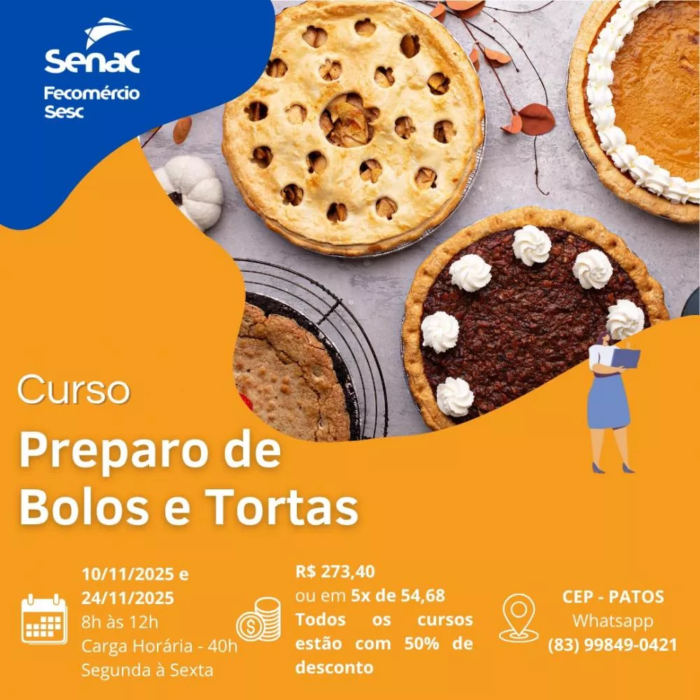- Preparo de Bolos e Tortas – R$ 273,42 ou 5x de R$ 54,68 (10/11 a 24/11 | 08h às 12h)