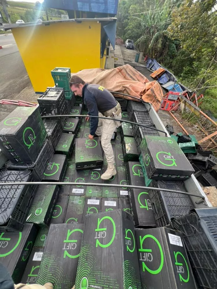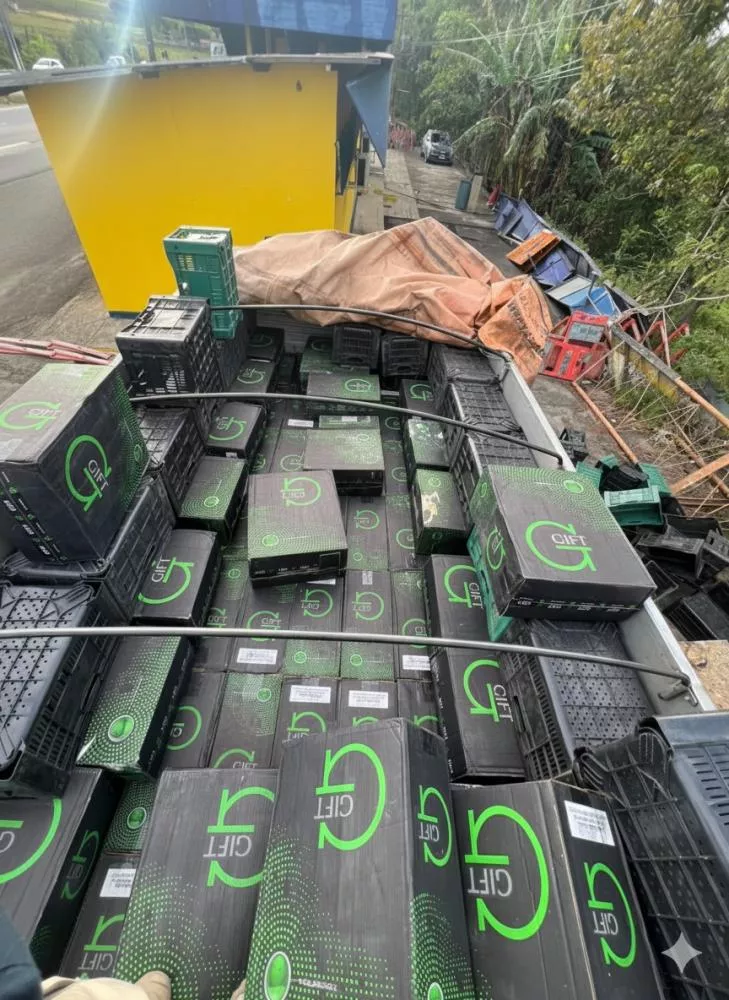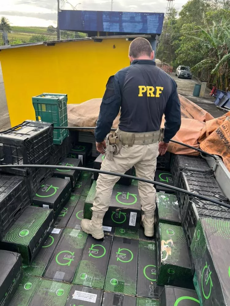 A ação ocorreu por volta das 16h, quando uma equipe da PRF abordou um caminhão Ford Cargo, de cor prata, no km 69 da rodovia. Durante a vistoria, os policiais observaram que o compartimento de carga continha algumas caixas plásticas de transporte, sob as quais estavam escondidas diversas caixas de papelão contendo cigarros da marca GIFT, de origem estrangeira.