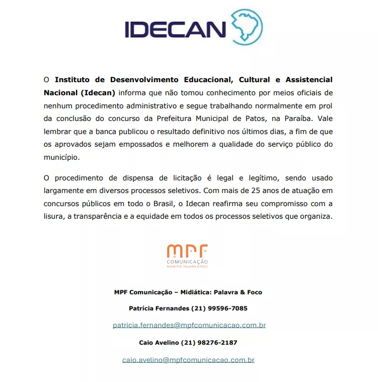 Procurado, o Idecan informou, por meio de sua assessoria de comunicação, que, até então, não havia tomando conhecimento por meios oficiais de nenhum procedimento administrativo instaurado. A banca afirmou que segue trabalhando normalmente até a conclusão das etapas restantes do concurso da Prefeitura Municipal de Patos e destacou que o procedimento de dispensa de licitação é legal e legítimo, sendo usado