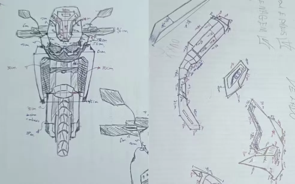 O projeto foi desenhado e calculado pelo estudante. Cada peça foi medida com o cuidado de quem tinha o objetivo de fazer a moto funcionar de verdade.