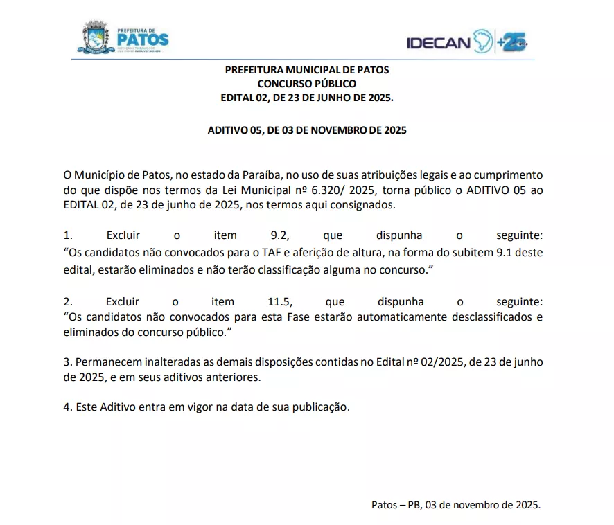 O Instituto de Desenvolvimento Educacional, Cultural e Assistencial Nacional (Idecan) publicou nesta segunda-feira (3) o Aditivo nº 05 ao Edital nº 02/2025 do concurso público para o cargo de Guarda Civil Municipal de Patos.