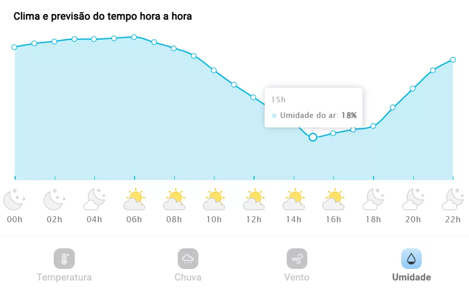 Além das altas temperaturas, o nível de umidade relativa do ar caiu para 18%, índice considerado crítico e comparável ao encontrado em regiões desérticas como o Saara. O valor está muito abaixo do mínimo recomendado pela Organização Mundial da Saúde (OMS), que é de 60%.